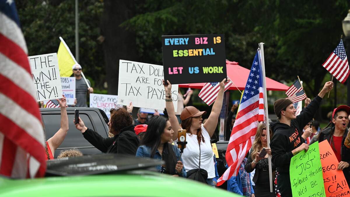 Hundreds of people are protesting the Governor Gavin Newsom’s stay-at-home order today (Monday, April 20th) at the State Capitol in Sacramento. Photo: GettyImages.